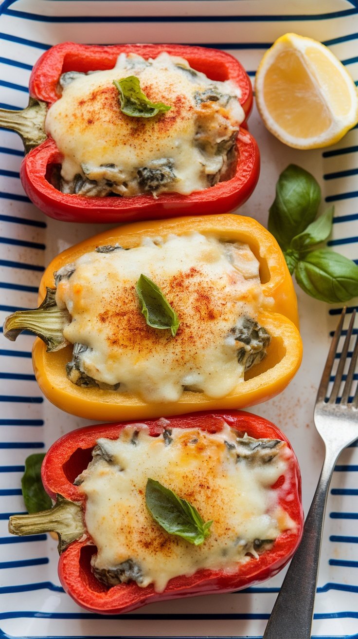 Brighten up your meal with these delightfulSpinach Artichoke Stuffed Bell Peppers. The combination of sautéed spinach, artichokes, and melted cheese creates a creamy filling that is packed with flavor. Each bell pepper is a little boat of goodness, ready to please your taste buds.